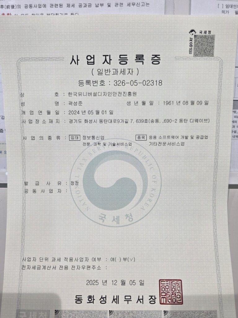 “한국유니버설디자인안전진흥원” 사업자 교부(2025.12.5)